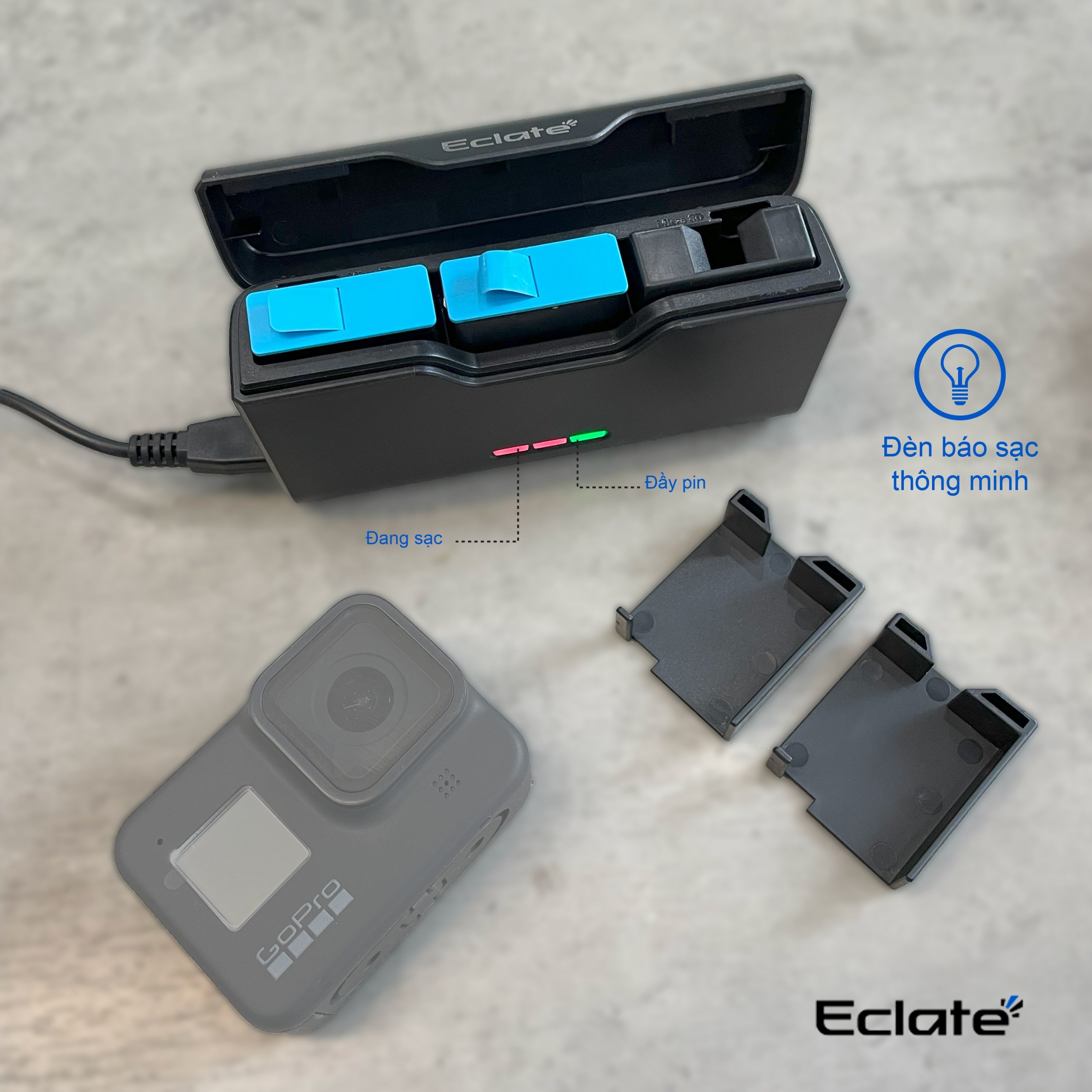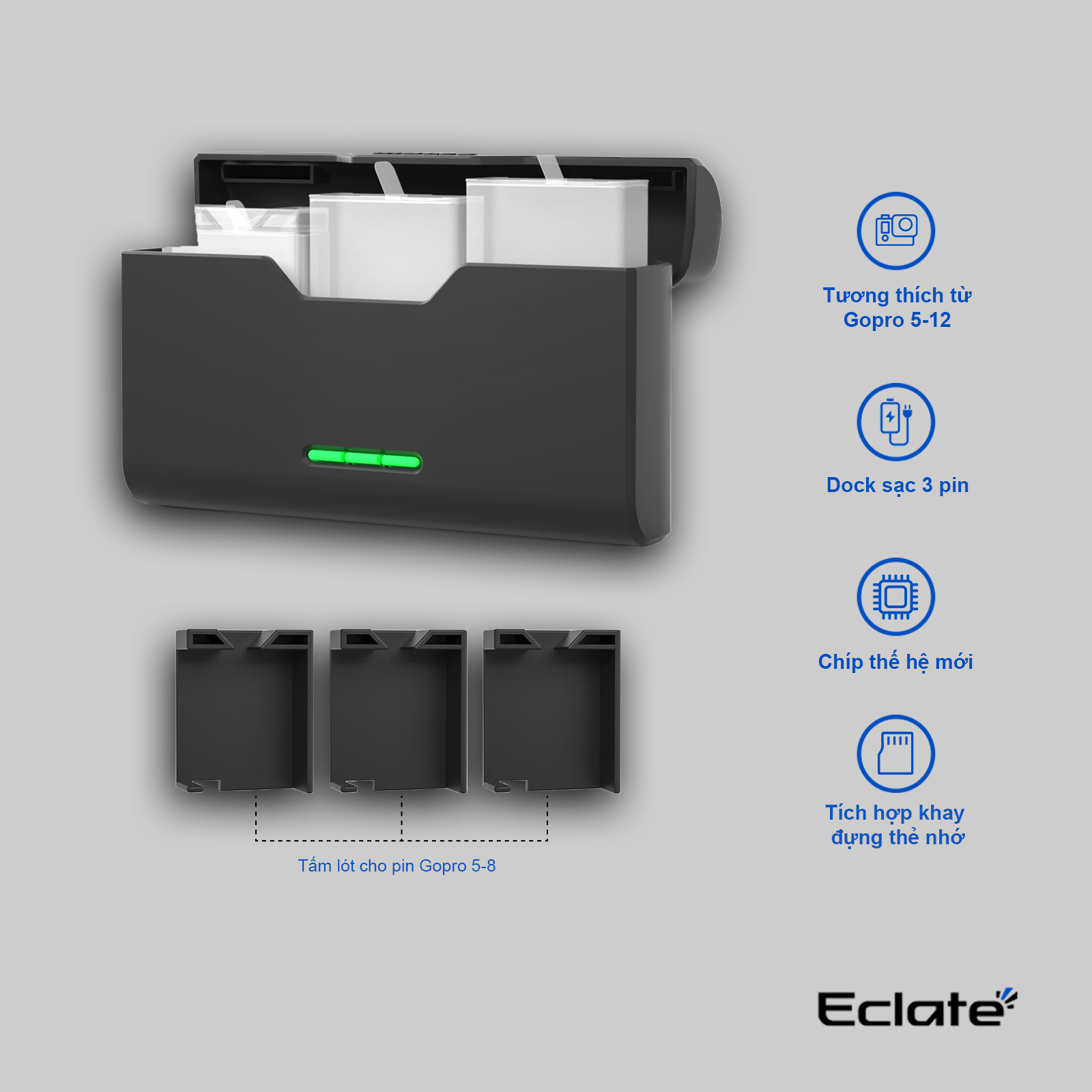 Dock sạc 3 pin Eclaté dành cho Gopro tích hợp 5/6/7/8/9/10/11/12 có khay đựng thẻ nhớ