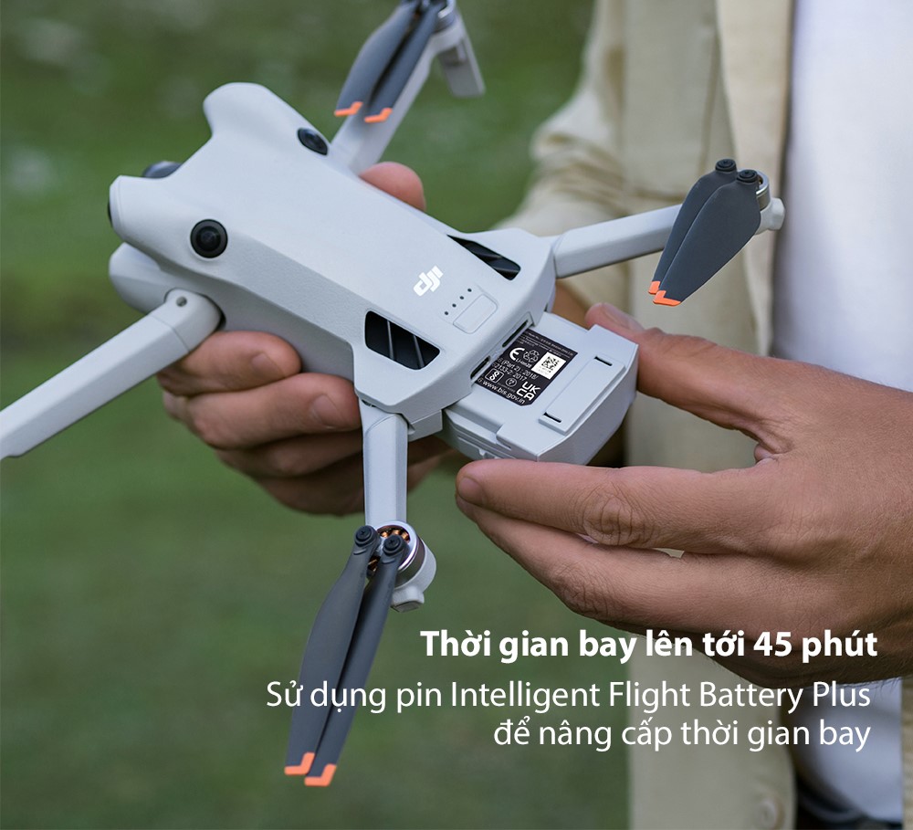 DJI Mini 4 Pro sử dụng dòng pin Intelligent Flight Battery, có thể bay lên đến 34 phút trong mỗi lần sạc. Bên cạnh đó, dòng máy bay không người lái mới cũng có thể dùng Intelligent Flight Battery Plus tương tự cho DJI Mini 3 Series để có thể tận hưởng thời gian bay tối đa lên tới 45 phút, giúp bạn tập trung vào việc sáng tạo và không cần lo lắng về việc sạc pin trong quá trình bay.