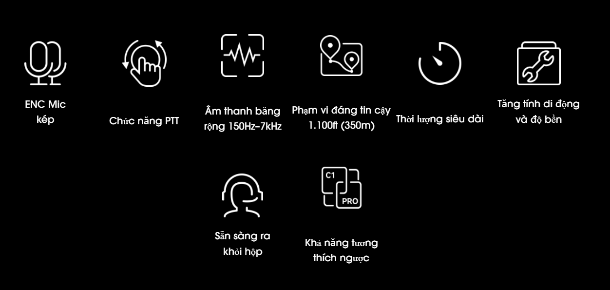 Với sơ đồ thiết kế ăng-ten kép cho mỗi tai nghe, Solidcom C1 Pro cho phép giao tiếp ổn định và rõ ràng, không bị nhiễu, với khả năng tăng gấp đôi dung lượng người dùng trên kênh liên lạc.