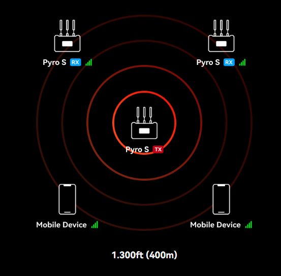 Với công nghệ Băng tần kép 2,4 GHz & 5 GHz tự phát triển, Pyro S có phạm vi truyền ổn định lên tới 1.300ft (400m). Nó đạt được độ trễ truyền tối thiểu là 50ms nhờ chip được nâng cấp và thuật toán mã hóa/giải mã video được tối ưu hóa.